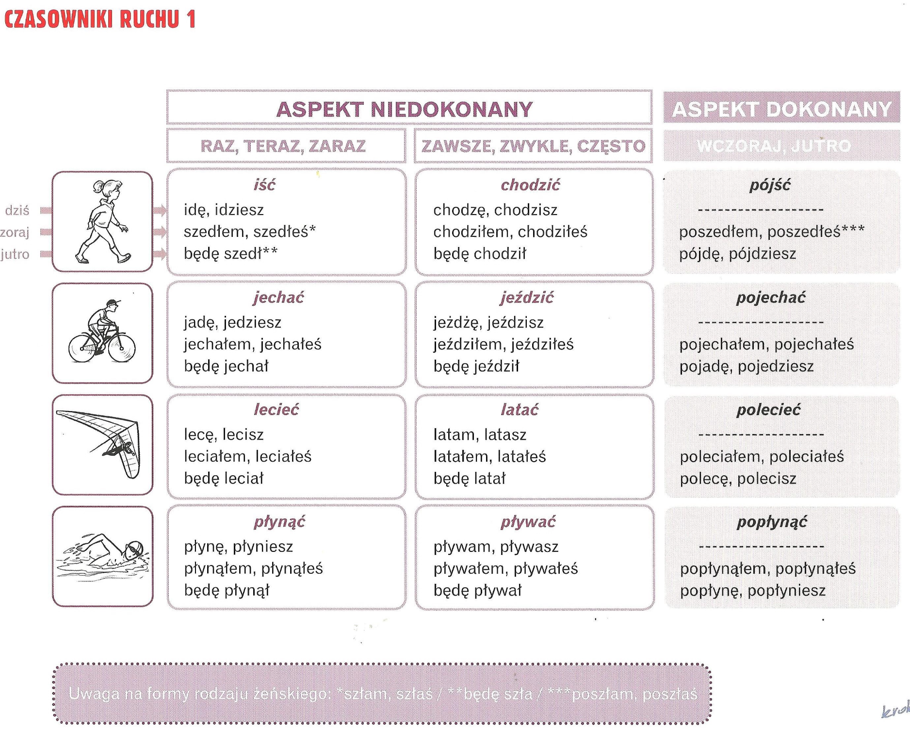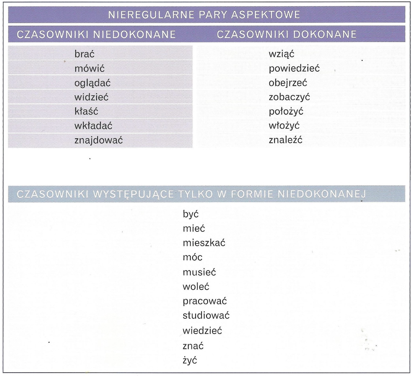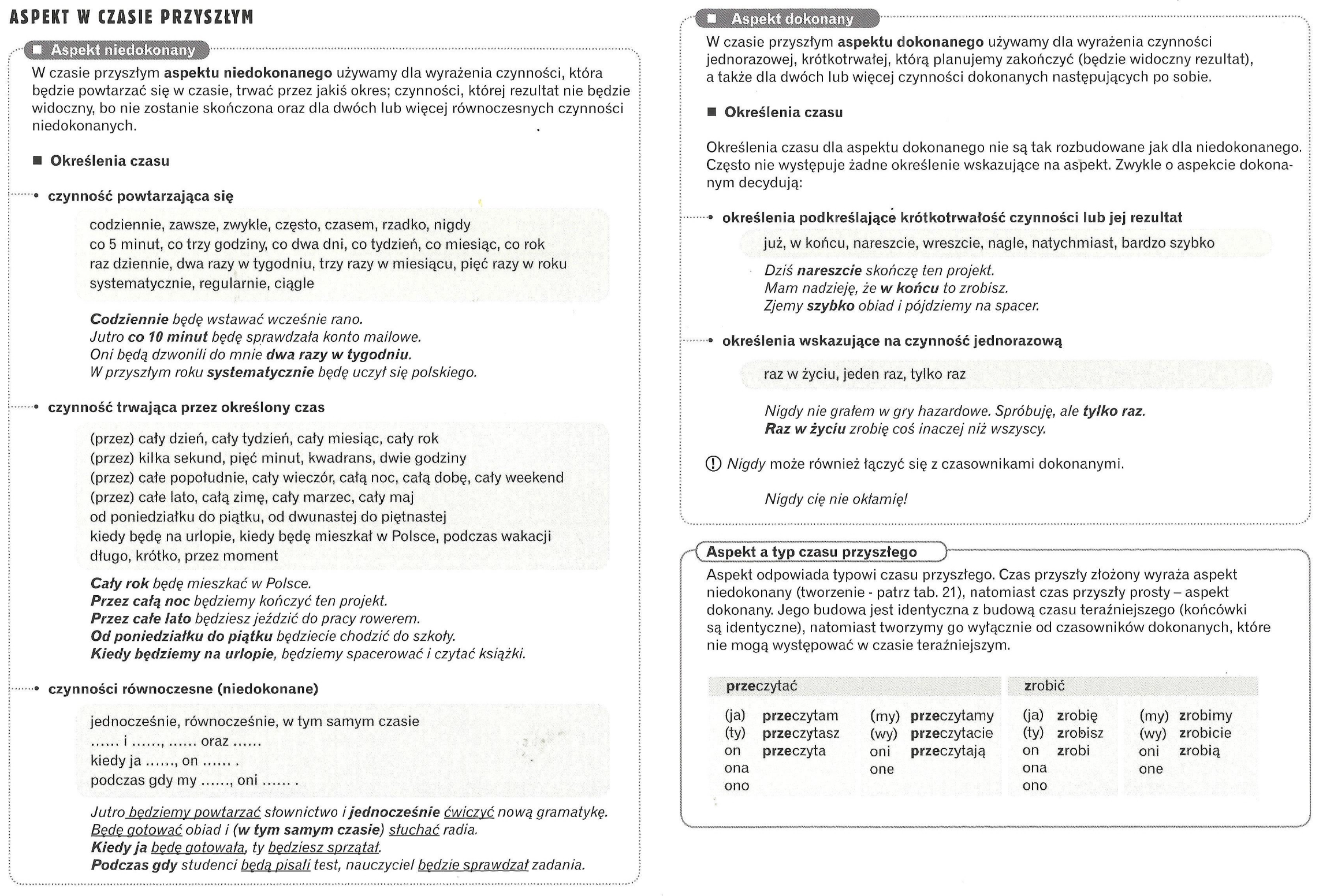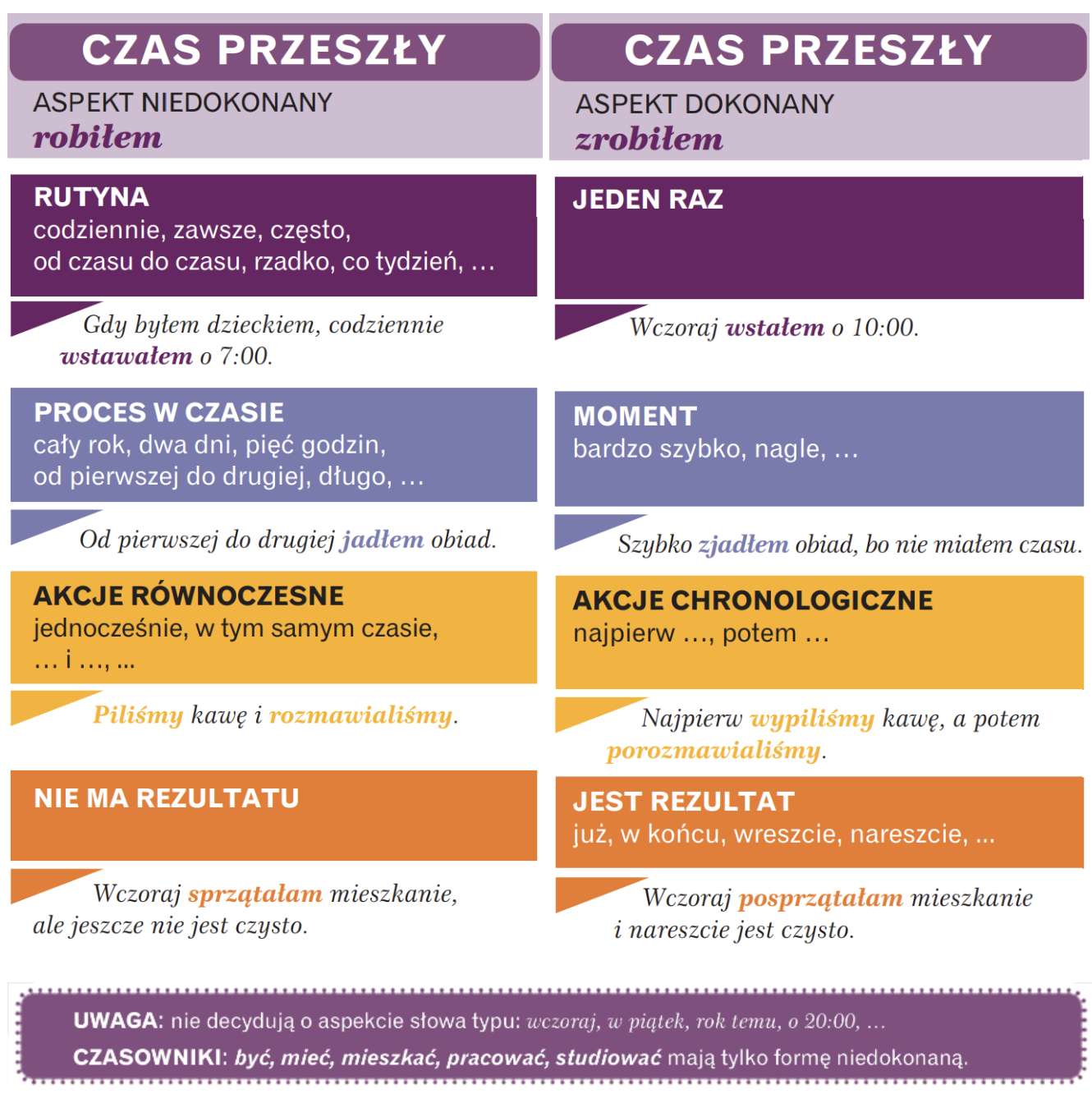 - Aspekt niedokonany (несовершенный) — действие процессуальное или повторяющееся, не акцентирует на результате.