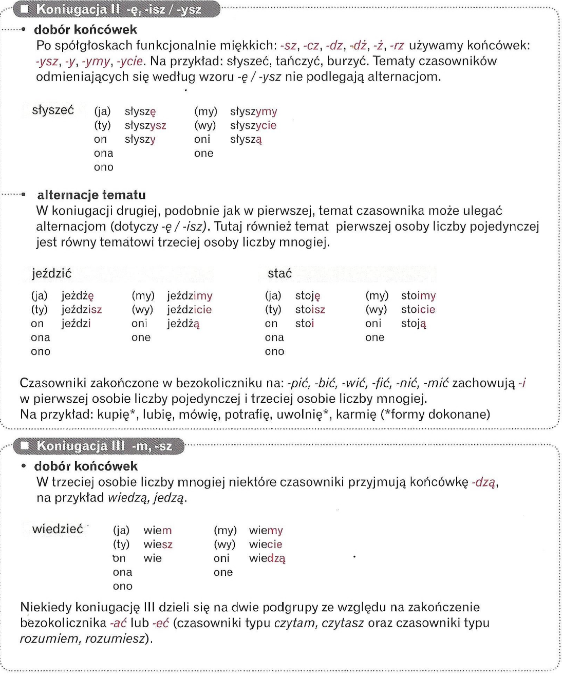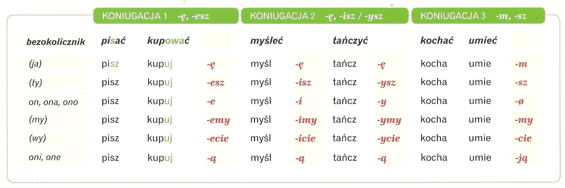 Odmieniając czasownik należy odciąć końcówkę bezokolicznika i dodać końcówki odpowiednej koniugacji.
