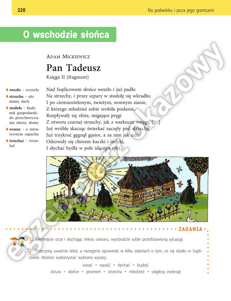 Opowiedz jeszcze raz, co się działo o wschodzie słońca w Soplicowie. Użyj podanych słów.