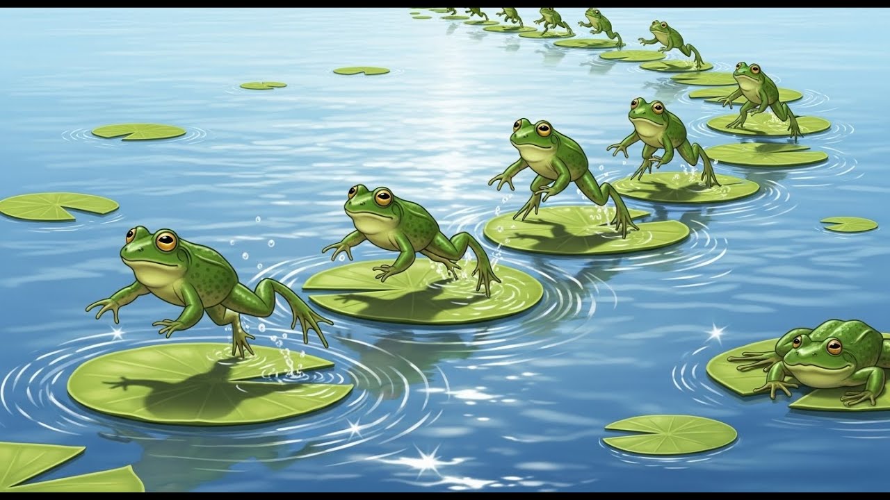 Лягушка прыгает по траве.